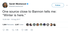 Shapiro believes that Bannon will now become a White Walker; an angel of death destroying all before him; foes and former allies alike.