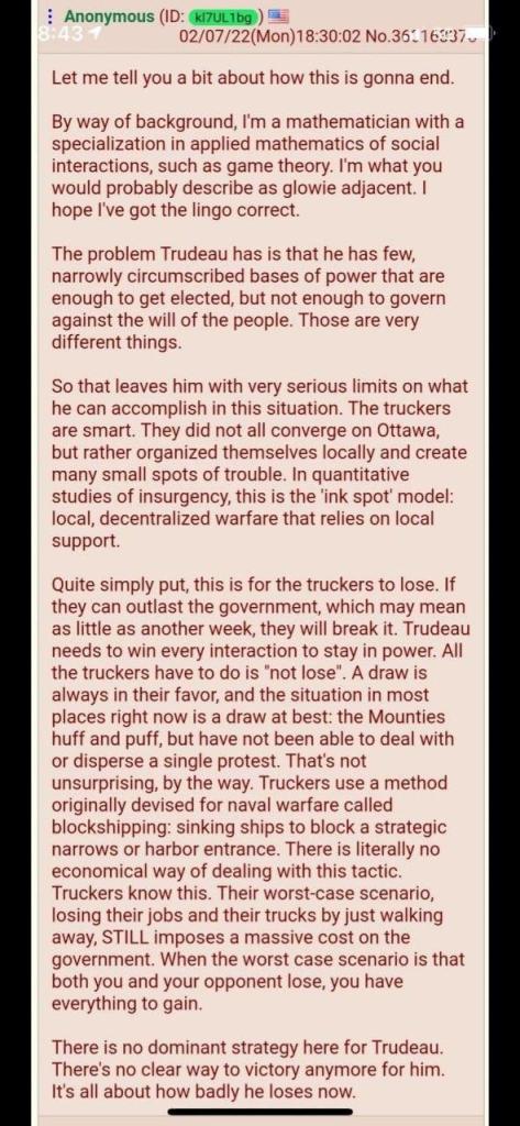 But there is a glimmer of hope, and how we need some. Trudeau has lost every round of this thus far. Every time he has made a move, he has weakened his position and the support for the protesters has grown.